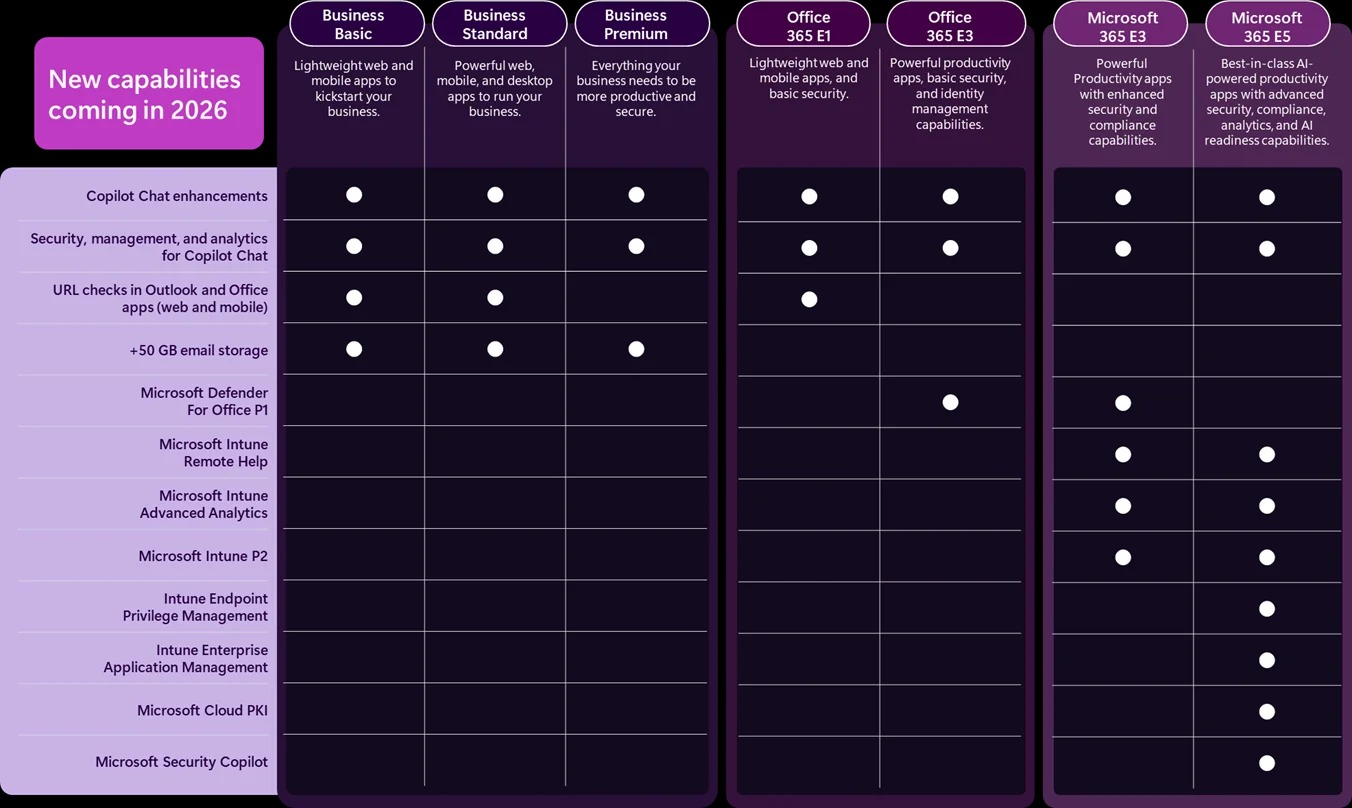 Microsoft 365 security enhancements 2025 เพิ่ม Microsoft Defender for Office 365 Plan 1 (email security ต่อต้าน phishing, malware) ให้ Office 365 E3 และ Microsoft 365 E3 รวม URL checks ใน E1, Business Basic, Business Standard เพื่อบล็อก malicious sites นอกจากนี้ Intune Remote Help, Advanced Analytics, Plan 2 จะเพิ่มใน E3/E5 เพื่อแก้ปัญหาเร็วขึ้น สำหรับ E5 ยังมี Endpoint Privilege Management, Enterprise Application Management, Cloud PKI เพื่อ mitigate risks และ secure AI use (Microsoft 365 Blog, 4 ธันวาคม 2025) ในยุคที่ threats เพิ่ม 70% ฟีเจอร์เหล่านี้ช่วย องค์กร ปกป้องข้อมูลโดยไม่เสีย productivity