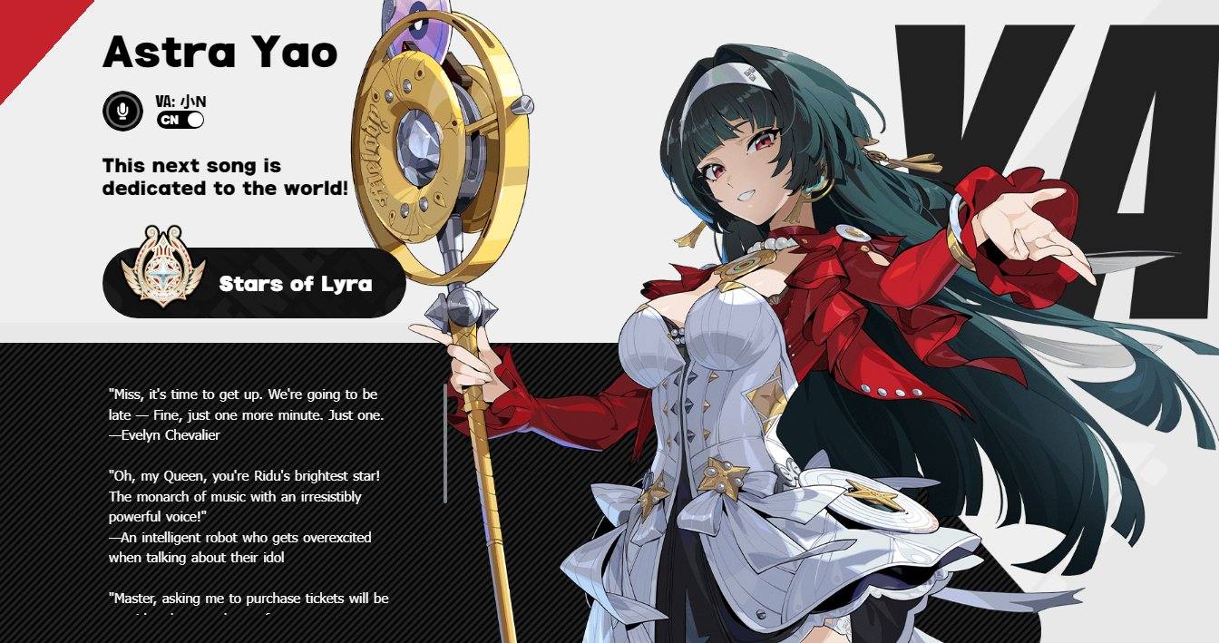 เธอมีภาพลักษณ์ที่โดดเด่นทั้งในแง่ของความสามารถและการออกแบบตัวละคร ด้วยการผสมผสานของธีมดนตรีและพลังที่เกี่ยวข้องกับ Ether ทำให้เธอกลายเป็นตัวละครที่แฟนเกมต่างจับตามองอย่างใกล้ชิด https://twitter.com/ZZZ_EN/status/1868144476625178628ความสามารถและบทบาทของ Astra Yao ใน Agent Record ที่ปล่อยออกมาได้มีการบอกใบ้เกี่ยวกับธาตุและบทบาทของ Astra Yao โดยเธอจะเข้ามาในฐานะตัวละคร Ether Support ซึ่งหมายความว่าเธอจะมีความสามารถที่เน้นไปที่การสนับสนุนทีม เช่น การเพิ่มพลังให้เพื่อนร่วมทีม ฟื้นฟูพลังชีวิต หรือช่วยเพิ่มสถานะพิเศษให้กับตัวละครอื่น
