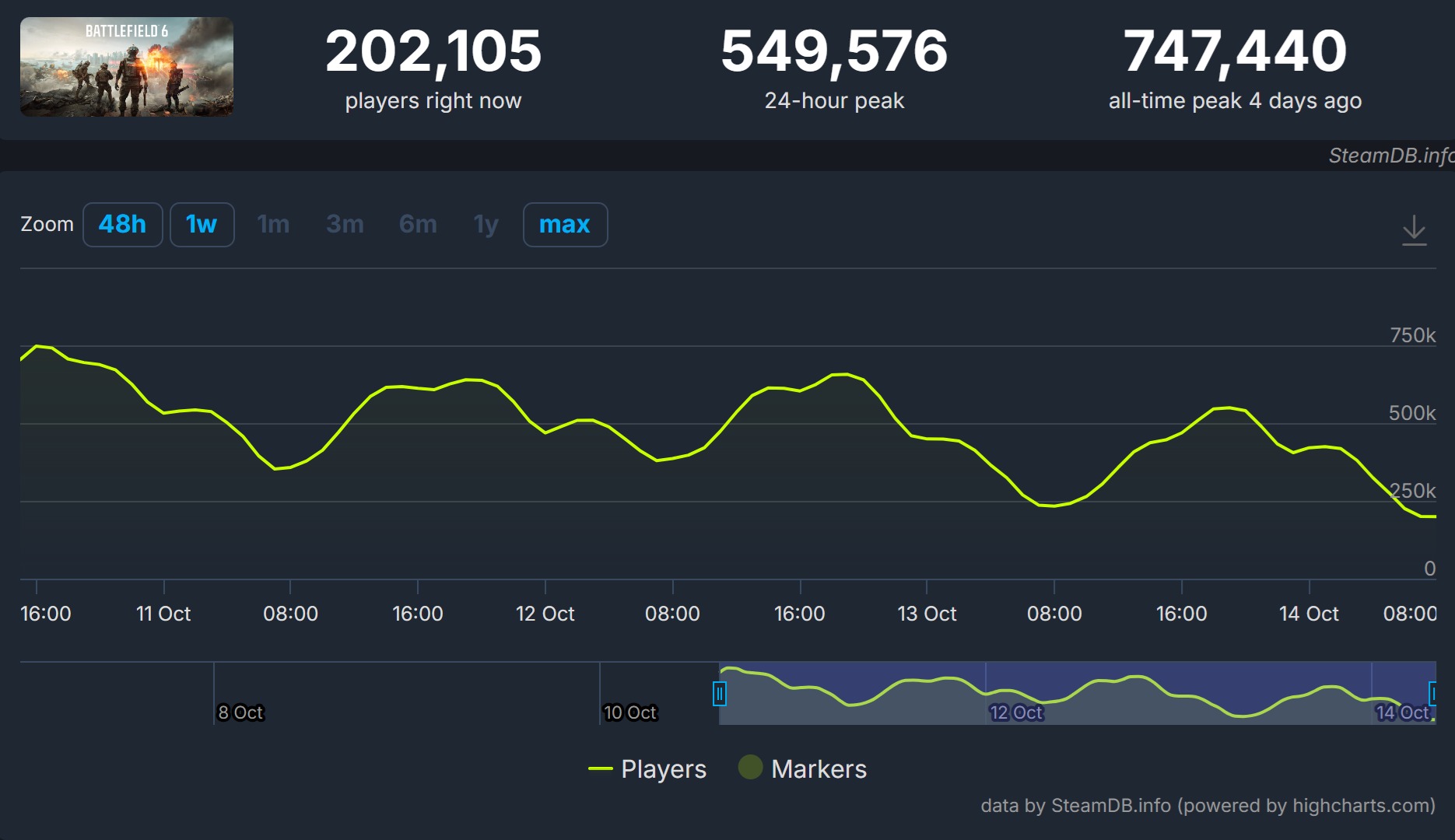 - จำนวนผู้เล่นพร้อมกัน (Peak Concurrent Players): ยอดผู้เล่นพร้อมกันสูงสุดบน Steam ในช่วงเปิดตัวพุ่งทะลุถึง 747,440 คน แม้ว่าตัวเลขนี้จะลดลงเล็กน้อยในช่วงสุดสัปดาห์ แต่ก็ยังคงมีผู้เล่นมากกว่า 435,000 คน ที่ออนไลน์พร้อมกัน ณ เวลาที่ทำรายงาน
