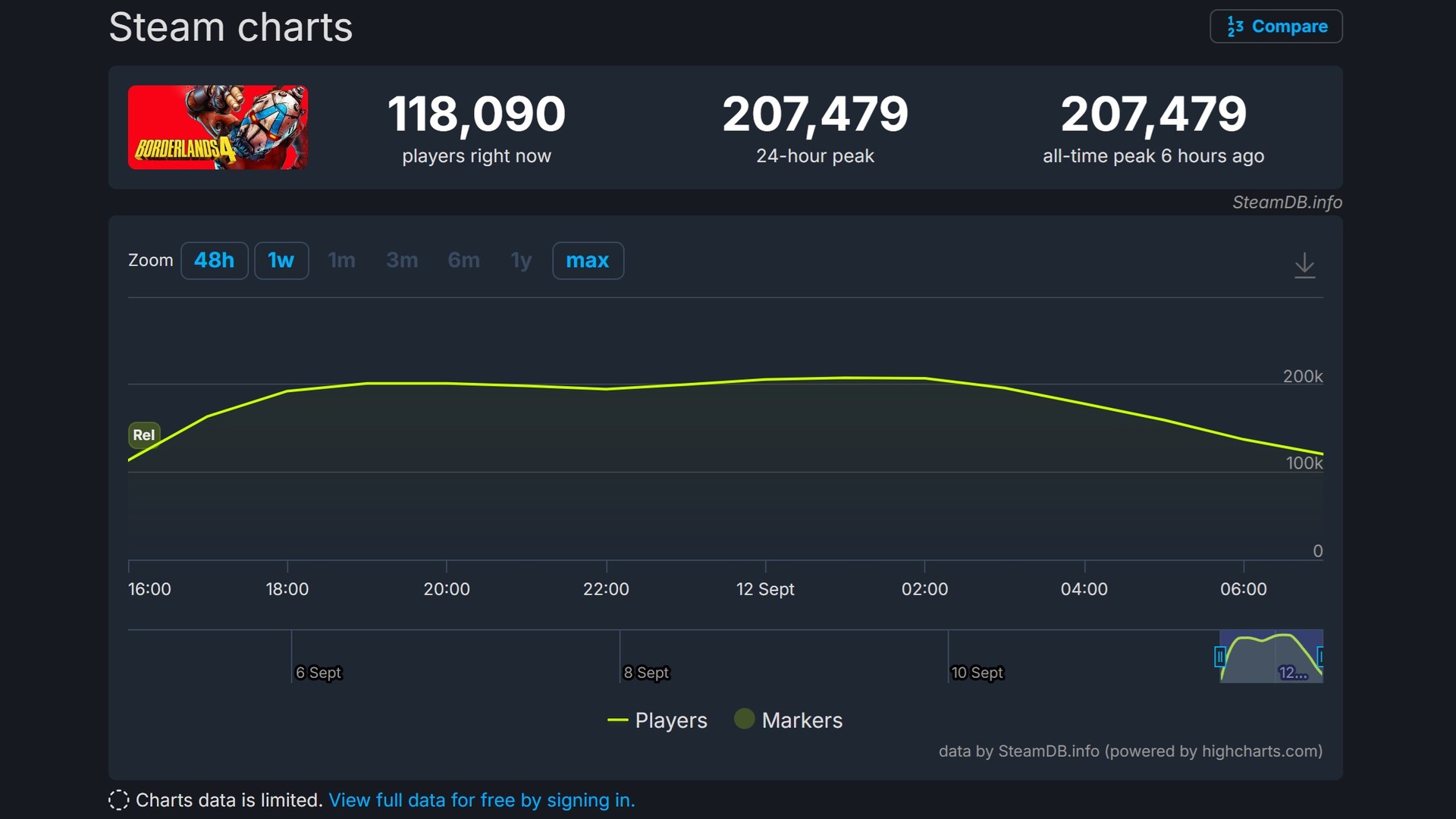 - ปัจจุบัน: 194,000+ (สูงกว่า Borderlands 2 ที่ 124,678 และ Borderlands 3 ที่ 93,820)