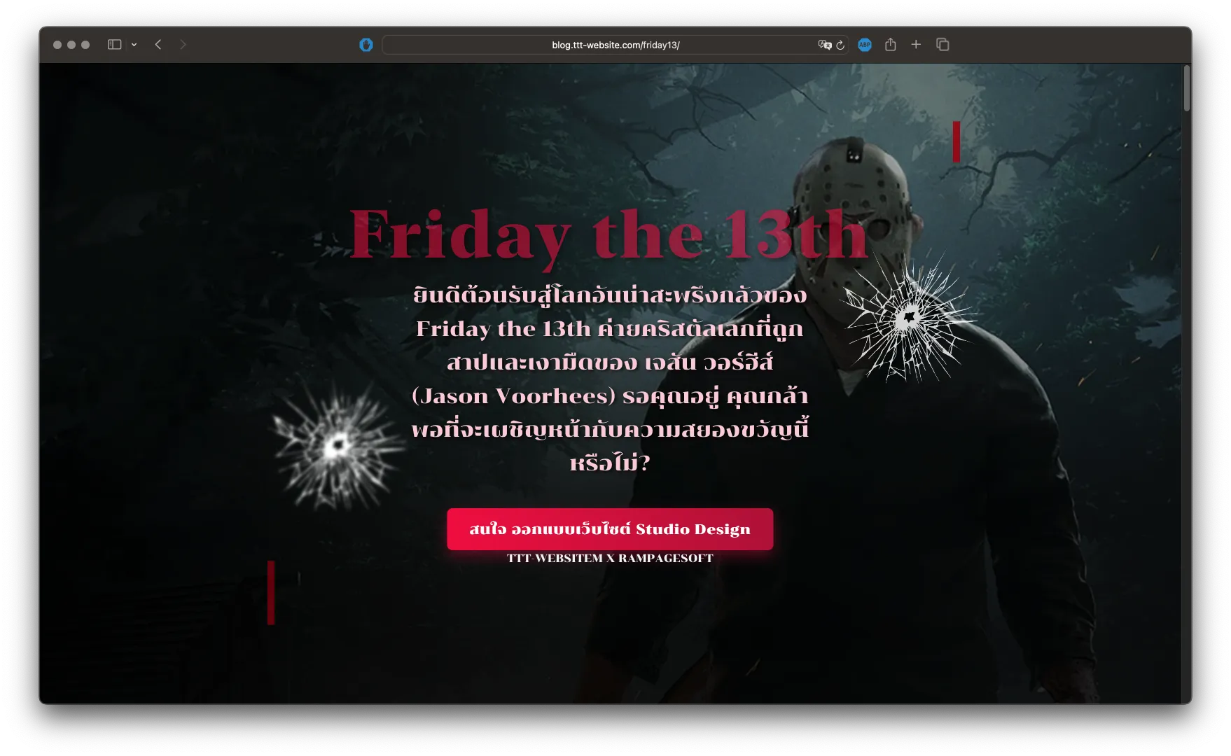 • การผสานเนื้อหา และบริการ : เว็บไซต์ไม่เพียงนำเสนอบทความเกี่ยวกับ FRIDAY THE 13TH แต่ยังแทรกการโปรโมตบริการออกแบบเว็บผ่านการออกแบบที่ทันสมัย และคำสำคัญ เช่น "WEB DESIGN STUDIO" ใน META TAGS และ SCHEMA
