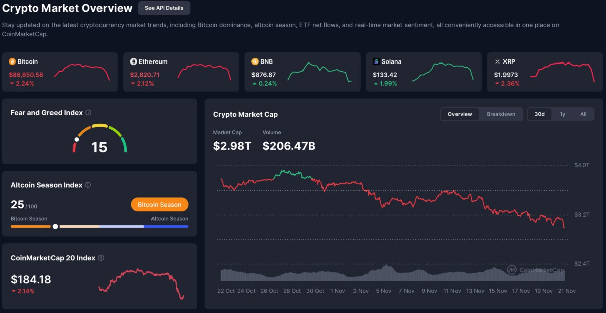 ตลาดรวมหดตัว: Market cap ลงเหลือ $3.21 ล้านล้าน จาก $3.79 ล้านล้าน ต้นเดือน – BTC อยู่ที่ $86K-$91K, ETH $3,000, DOGE range-bound $0.19-$0.20
