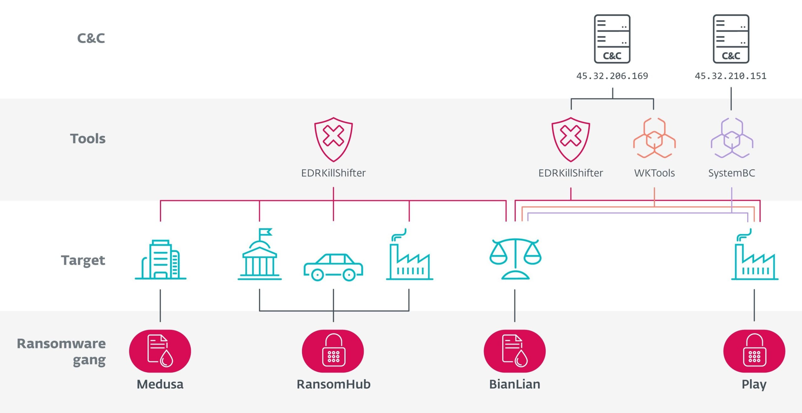 จากการวิเคราะห์พบว่า RansomHub ซึ่งเป็นกลุ่มแฮกเกอร์ที่มีการใช้ EDRKillShifter ในการโจมตีได้เริ่มร่วมมือกับกลุ่มมัลแวร์อื่น ๆ เช่น Medusa, BianLian, และ Play โดยการนำเครื่องมือดังกล่าวไปใช้งานในการโจมตีของตนเอง