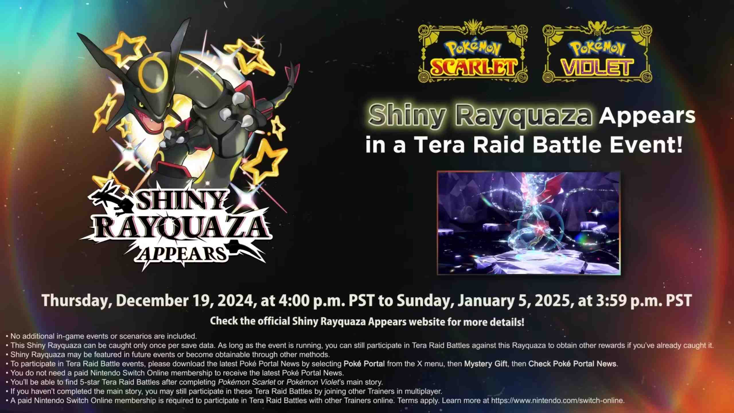 อย่าลืมทำเครื่องหมายวันที่ 19 ธันวาคมนี้ไว้ในปฏิทินของคุณ! เตรียมทีมโปเกมอนของคุณให้พร้อมและเข้าร่วมการต่อสู้เพื่อคว้า Shiny Rayquaza ที่หายากนี้มาให้ได้