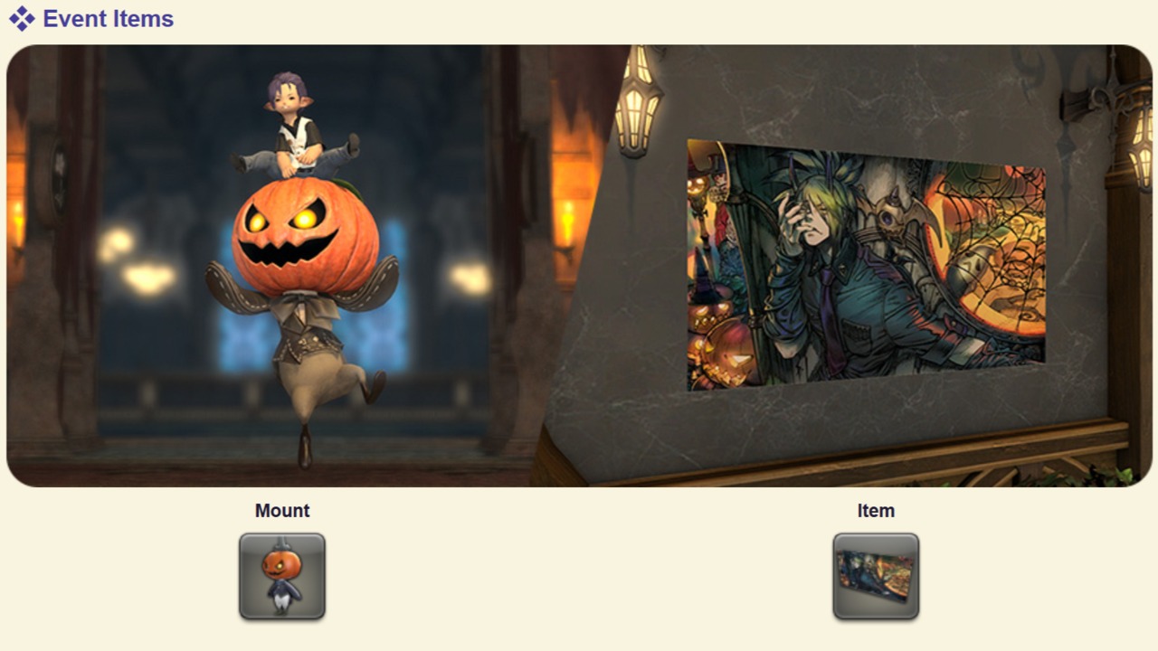 - Ambulario Mount: เป็น Mount ตัวใหม่ล่าสุดที่มาในรูปแบบของ Mandragora หัวฟักทองสุดน่ารัก ที่พร้อมจะพาคุณท่องไปในโลก Eorzea ด้วยบรรยากาศสุดหลอน