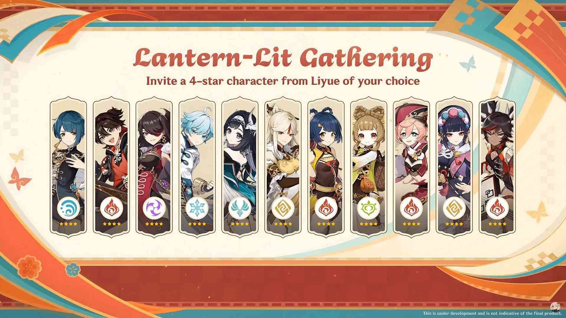 - ผู้เล่นสามารถเลือกตัวละคร 4 ดาวจาก Liyue ได้ฟรี รวมถึงตัวละครที่เป็นที่นิยม เช่น Xiangling, Ningguang, Beidou, หรือ Chongyun
