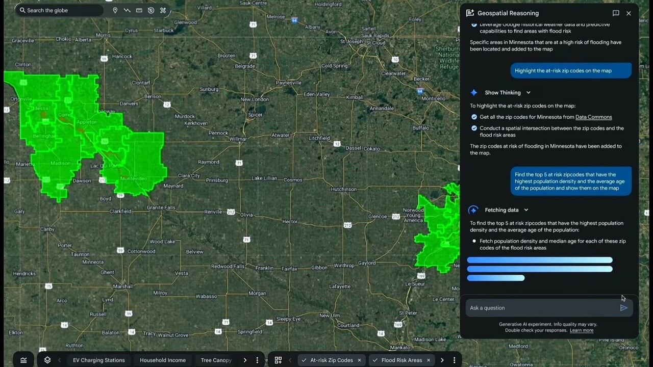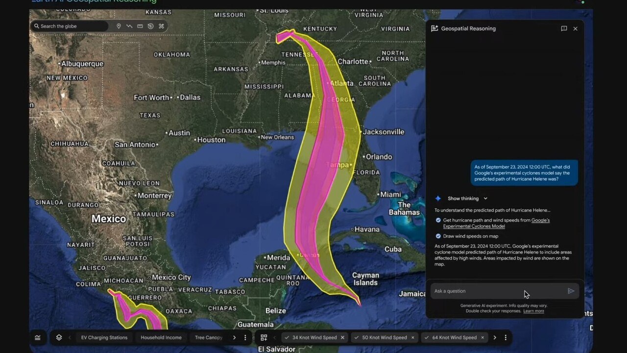 geospatial reasoning ช่วยให้เห็นความเสี่ยงที่ซ่อนอยู่ เช่น พายุที่อาจกระทบพื้นที่หนาแน่น หรือต้นไม้ใกล้สายไฟที่เสี่ยงไฟไหม้ ตามรายงานจาก