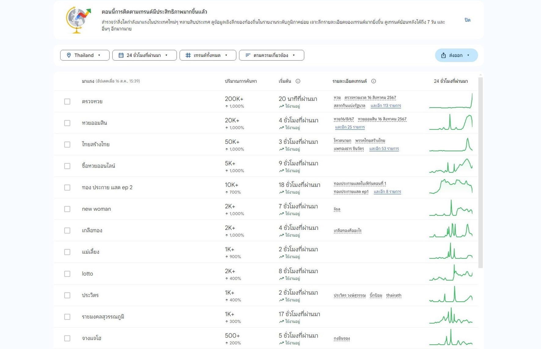 เพื่อให้เข้าใจได้ง่ายยิ่งขึ้น 'Trending Now' จะแสดงรายละเอียดของแต่ละเทรนด์ รวมถึงวันที่เริ่มต้น ระยะเวลา และบทความข่าวที่เกี่ยวข้อง นอกจากนี้ ยังมีการแสดงภาพกราฟิกของความสนใจในการค้นหาตามช่วงเวลา ซึ่งช่วยให้เปรียบเทียบเทรนด์ และส่งออกข้อมูลได้ง่ายขึ้น