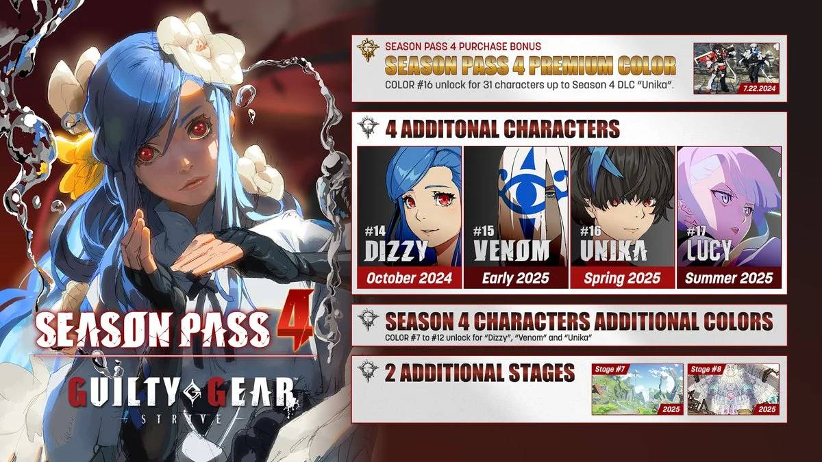 - อีเวนต์: Arc System Works เตรียมจัดอีเวนต์พิเศษมากมายสำหรับผู้เล่น Guilty Gear Strive ฤดูกาล 4 ผู้เล่นสามารถร่วมสนุกกับกิจกรรมต่างๆ รับรางวัล และพบปะผู้เล่นอื่นๆ