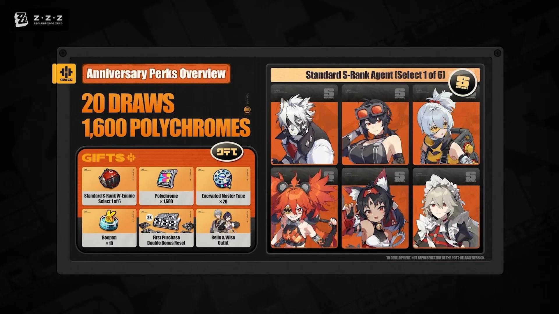 - S-Rank Agent ฟรี: เลือกตัวละคร S-Rank จาก Standard Banner ได้ 1 ตัว เช่น Lycaon, Grace, Soldier 11, Koleda, Nekomata, หรือ Rina